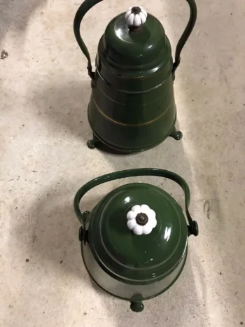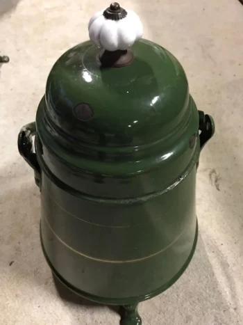 - V zelenem emajlu s krempljastimi nogicami, porcelanastim gumbom in zlato oblogo